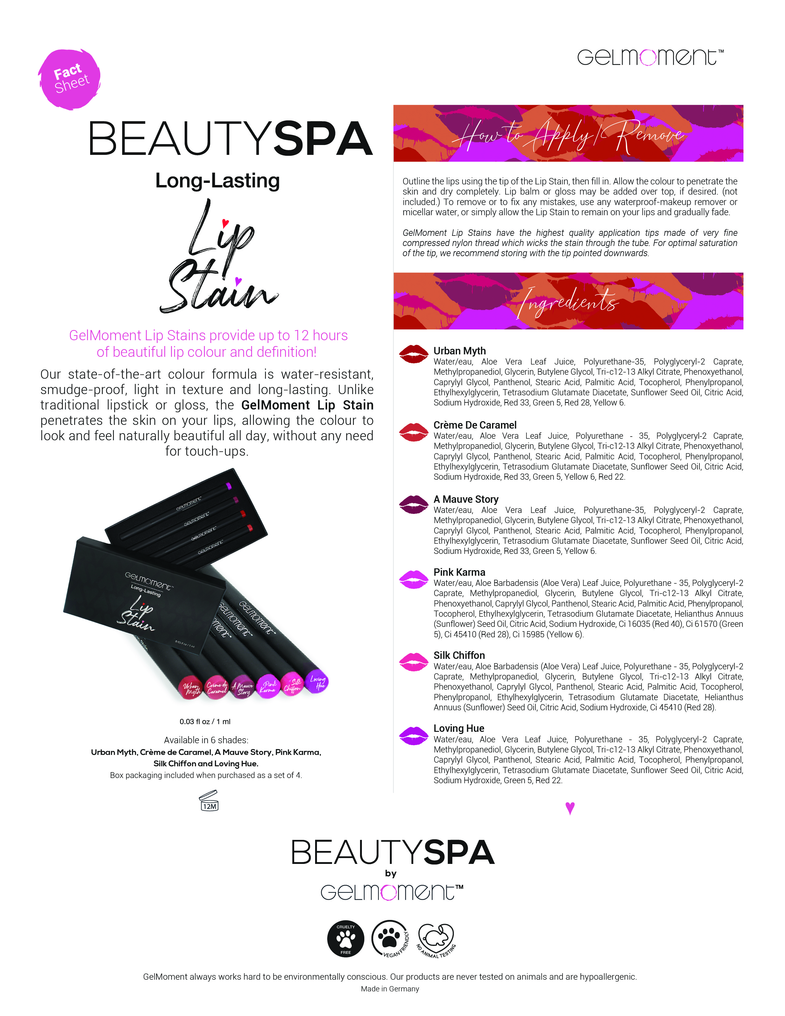 GelMoment Lip Stains provide up to 12 hours of beautiful lip colour and definition! The unique fine point tip makes it easy to apply with precision.